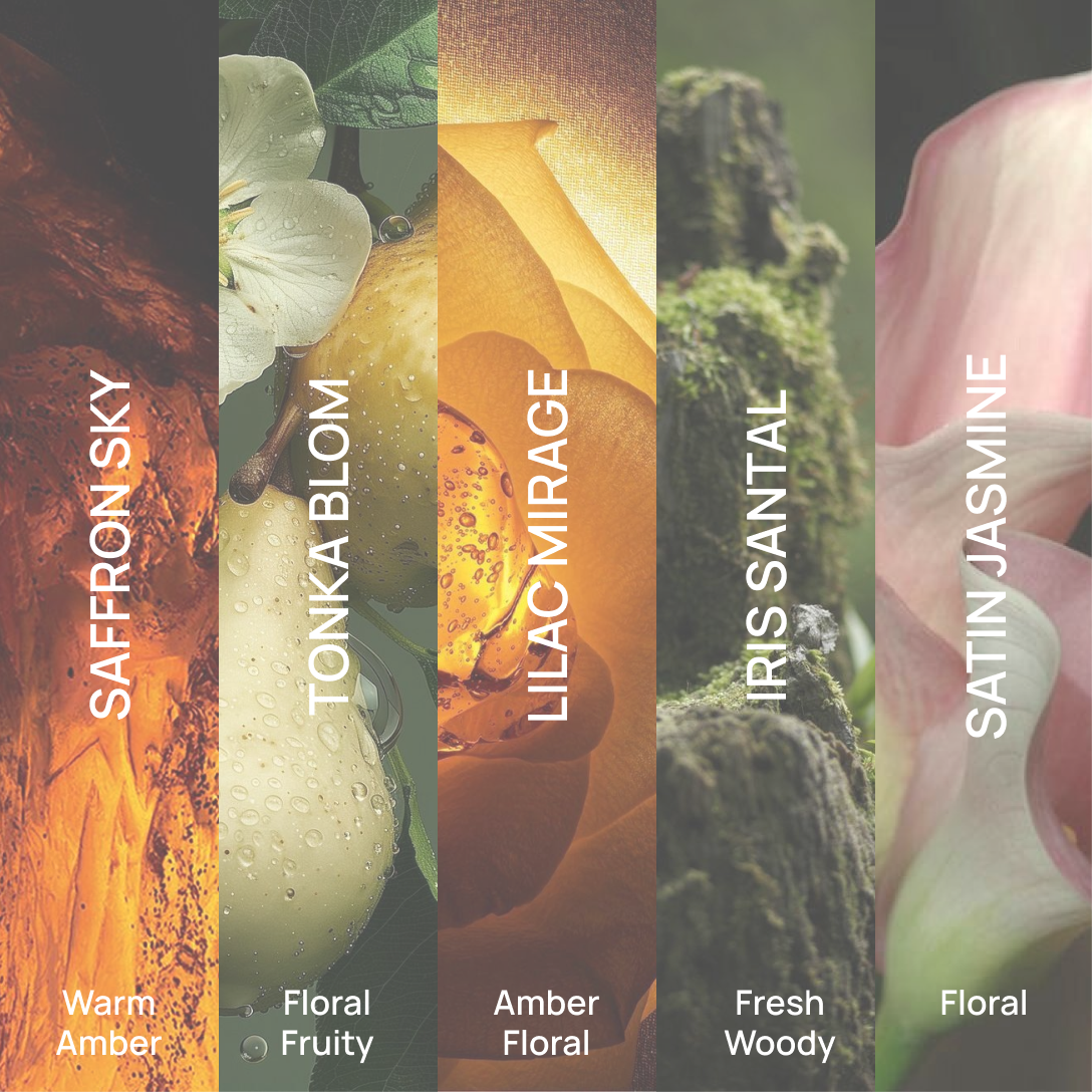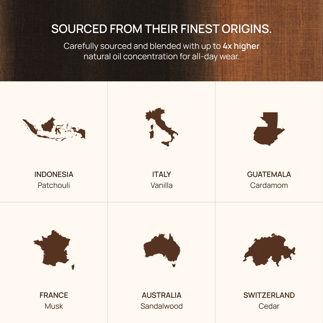 It all begins with the ingredients. We carefully source the finest oils from around the world - French woods, Italian citrus, Indian florals, each chosen for its purity and character. The secret lies in how they blend together. The scent opens light, almost weightless and then slowly deepens into warmth and quiet richness. Its true magic is only revealed when it touches your skin.