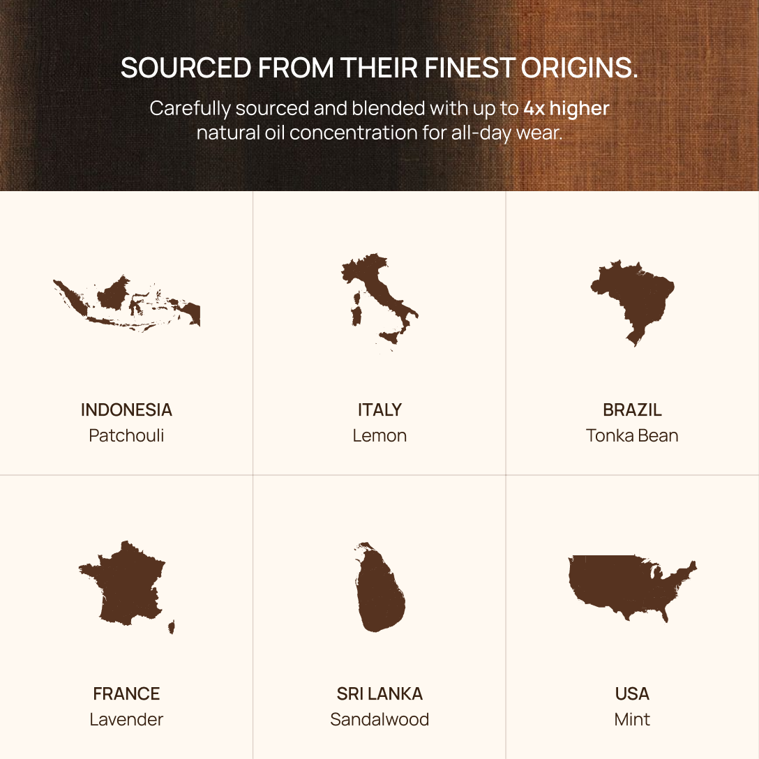 It all begins with the ingredients. We carefully source the finest oils from around the world - French woods, Italian citrus, Indian florals, each chosen for its purity and character. The secret lies in how they blend together. The scent opens light, almost weightless and then slowly deepens into warmth and quiet richness. Its true magic is only revealed when it touches your skin.