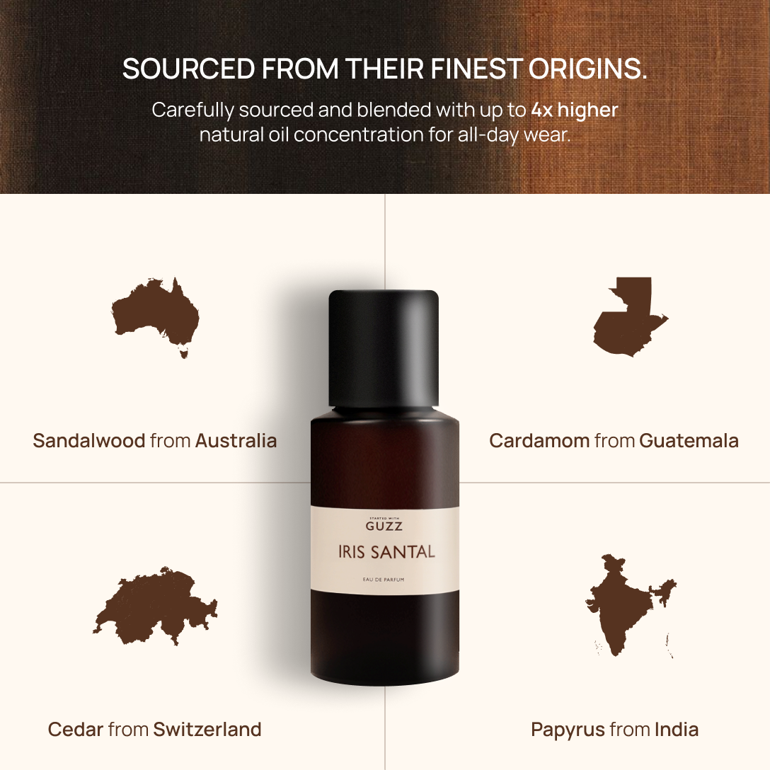 It all begins with the ingredients. We carefully source the finest oils from around the world - French woods, Italian citrus, Indian florals, each chosen for its purity and character. The secret lies in how they blend together. The scent opens light, almost weightless and then slowly deepens into warmth and quiet richness. Its true magic is only revealed when it touches your skin.
